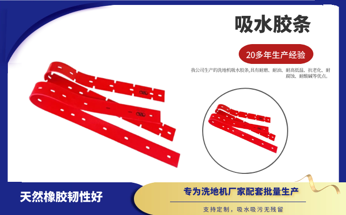 產品說明:吸水膠條是洗地機吸水扒上的重要部件,作用就是與地面接觸,產生一個密封的空間,把地面上的污水通過風機進行回收。吸水膠條一般分為耐油型(進口PU原料)和普通型(進口NR原料)兩種。
